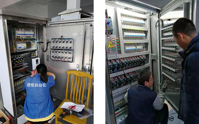 圖為公司技術(shù)人員在為準(zhǔn)備發(fā)往廣州大陵河某凈水廠的PLC自動(dòng)化控制柜作發(fā)貨前的驗(yàn)收