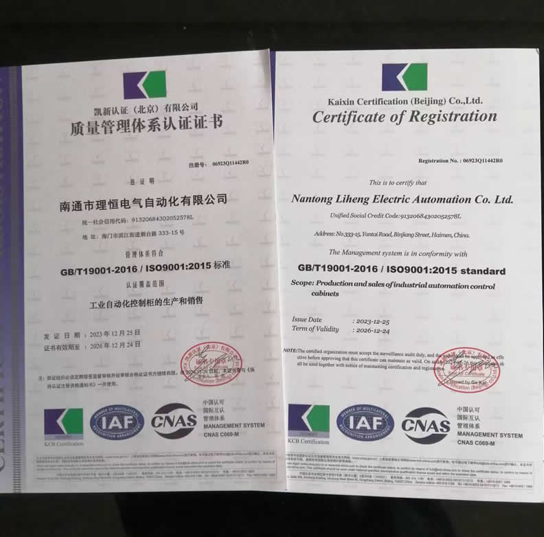 前不久,經中國質量認證中心有關專家的現場檢查復核,認定我司工業(yè)自動化控制柜的生產和銷售體系符合GB/T19001-2016/ISO9001:2015標準,并給我司頒發(fā)了認證證書。
